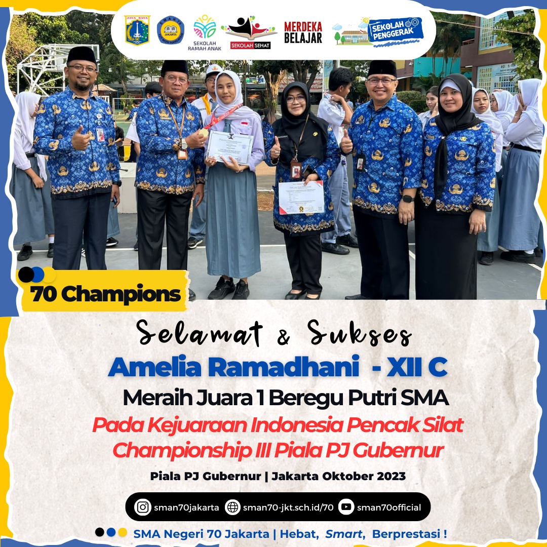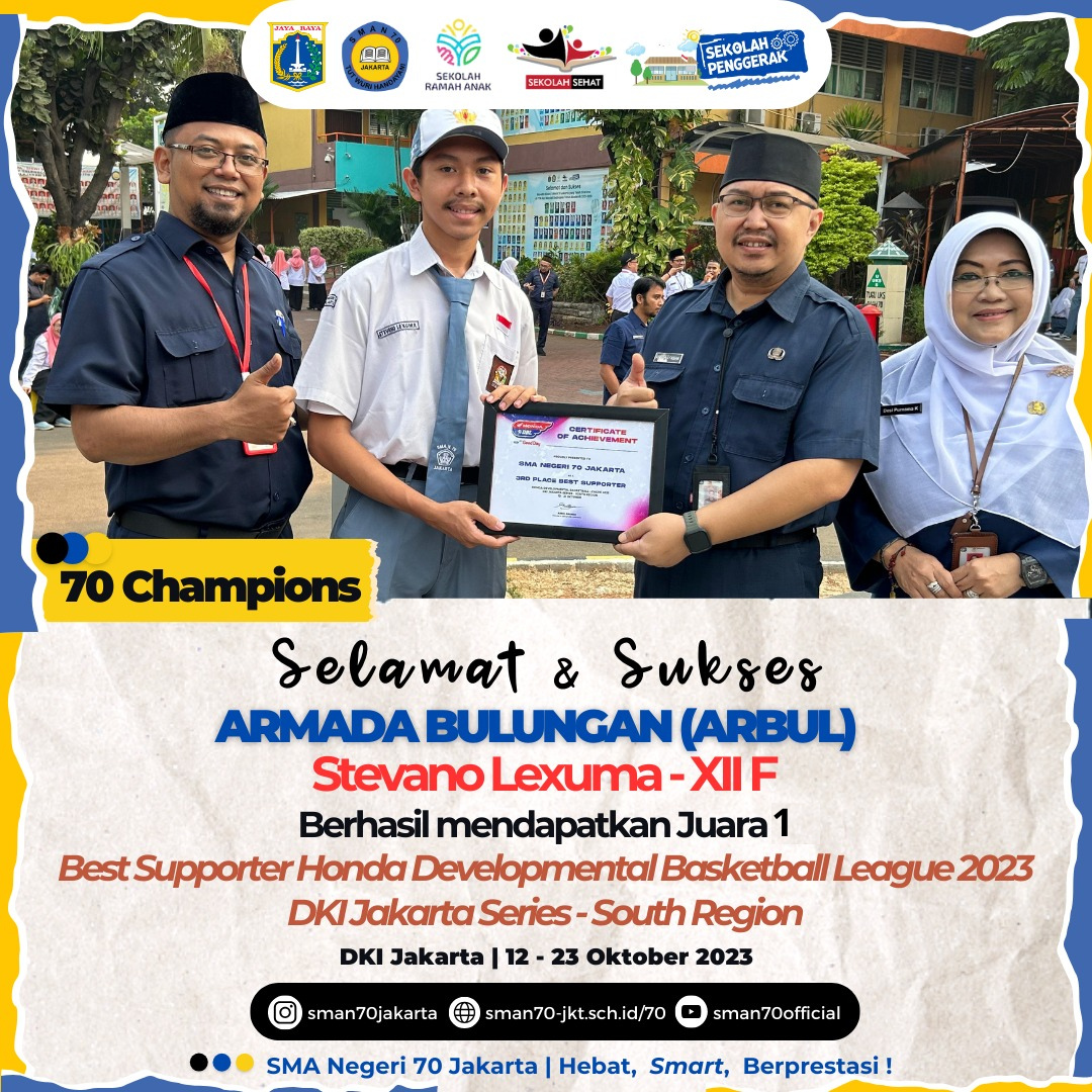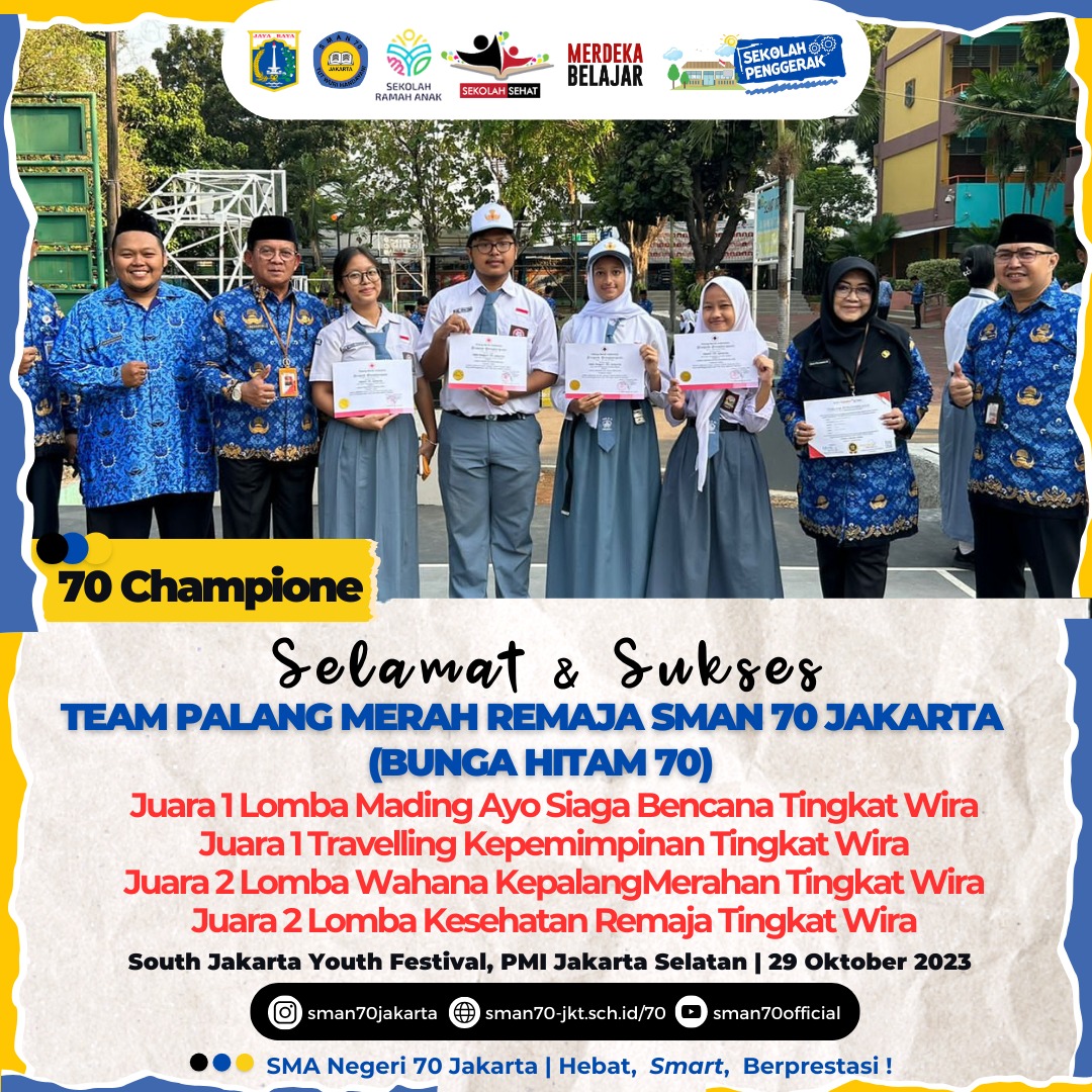 🏆70 Champions🏆 Hallo, Sobat bulungan !Ada kabar gembira dari teman kita yang tergabung dalam Team PMR 70.berhasil meraih🏆 Juara 1 Lomba Mading Ayo Siaga Bencana Tingkat Wira 🏆 Juara 1 Travelling Kepemimpinan Tingkat Wira 🏆 Juara 2 Lomba Wahana KepalngMerahan Tingkat Wira 🏆 Juara 2 Lomba Kesehatan Remaja Tingkat Wira ✨ South Jakarta Youth Festival, OMI Jakarta Selatan✨Selamat PMR 70! Harapan semoga hal ini bisa menginspirasi sobat bulungan 70 dan tak lupa terima kasih kepada Para pendukung kegiatan yang sudah terlibatyang mana membantu kesuksesan Team PMR 70.