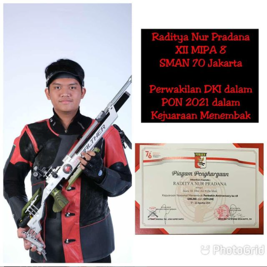 Dan siswa tampan nan keren ini adalah salah satu siswa dengan segudang prestasi. Raditya adalah salah satu atlet andalan bagi kontingen menembak DKI Jakarta untuk meraih emas di PON XX di Papua. Sebelum berangkat ke Papua, Radit berhasil meraih Juara III Kejurnas Menembak Perbakin Anniversary dalam kategori 10m Air Rifle Men.