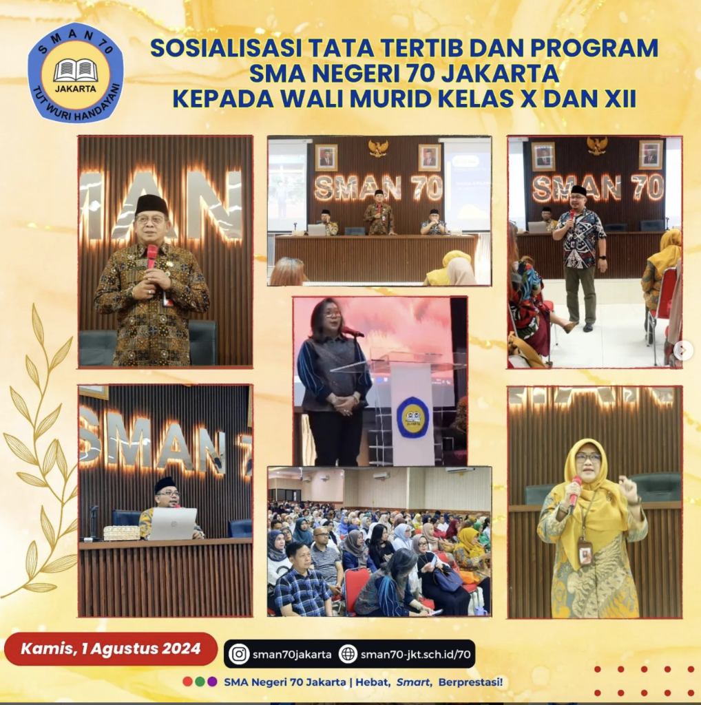 Kegiatan Sosialisasi Tata Tertib dan Program SMA Negeri 70 Jakarta merupakan agenda penting yang ditujukan kepada wali murid kelas X dan XII. Acara ini bertujuan untuk memberikan pemahaman mendalam mengenai tata tertib sekolah, program akademik, dan kegiatan pengembangan karakter serta sarana prasarana yang dirancang untuk mendukung kemajuan peserta didik di SMAN 70. Dalam sosialisasi ini, wali murid diajak untuk bekerja sama dengan sekolah dalam menciptakan lingkungan belajar yang kondusif dan membangun komunikasi yang solid demi keberhasilan pendidikan putra-putri mereka.